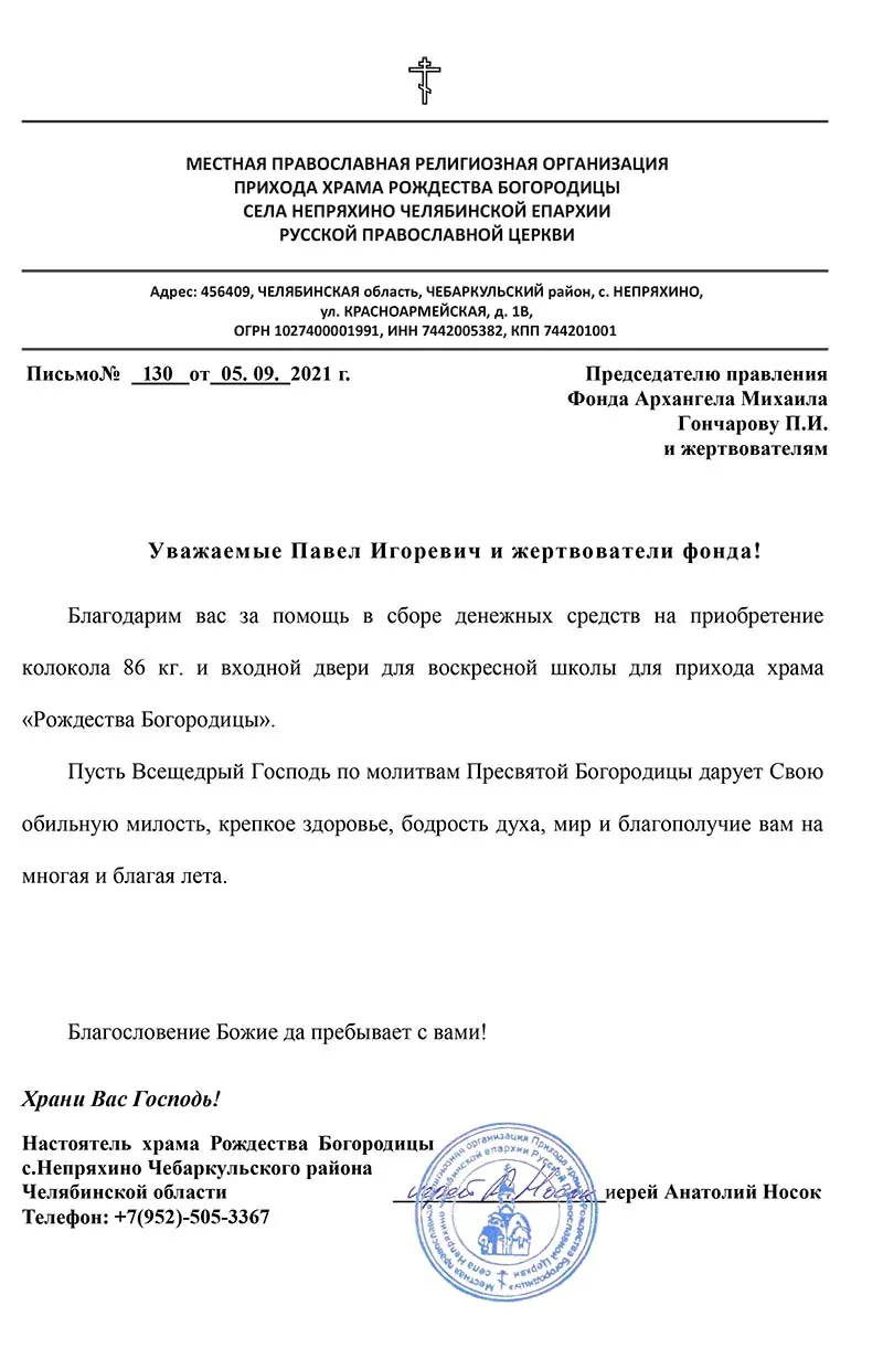 Мы с Вами подарили Успенскому храму колокола, и это большая радость! В их голосе звучит частичка Вашей доброты!