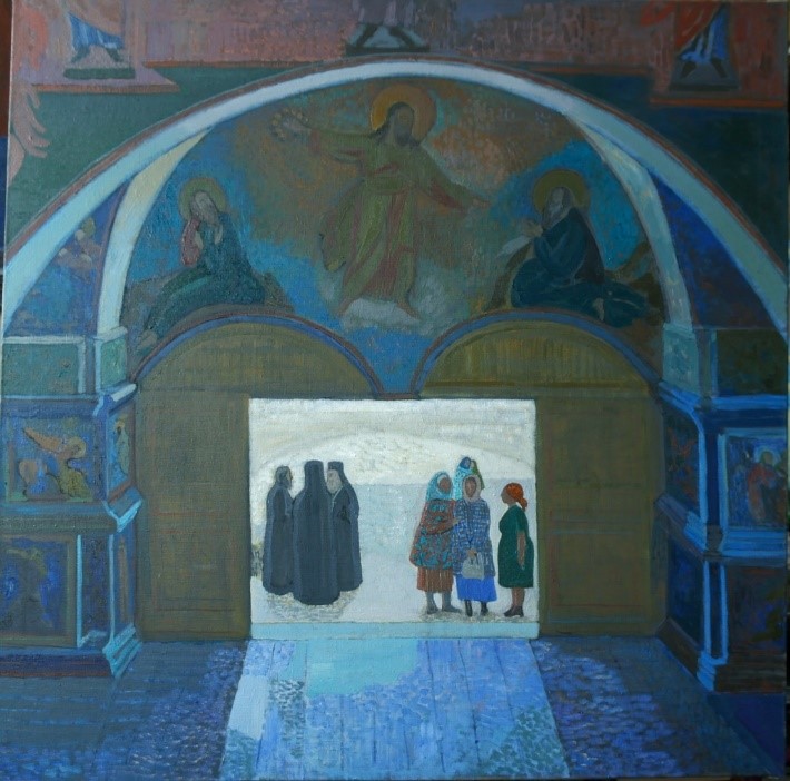 – В Новоспасском монастыре я долго ходила и искала свое, ведь раньше я почти ничего не писала на тему храмов. Но я подумала, что могу «высечь» из себя некую жизнь в соприкосновении с этой темой, нечто близкое мне. И я написала монахов и мирян в притворе храма, а над ними – образ Христа. У них разный образ жизни, но и те, и другие любимы Богом одинаково.