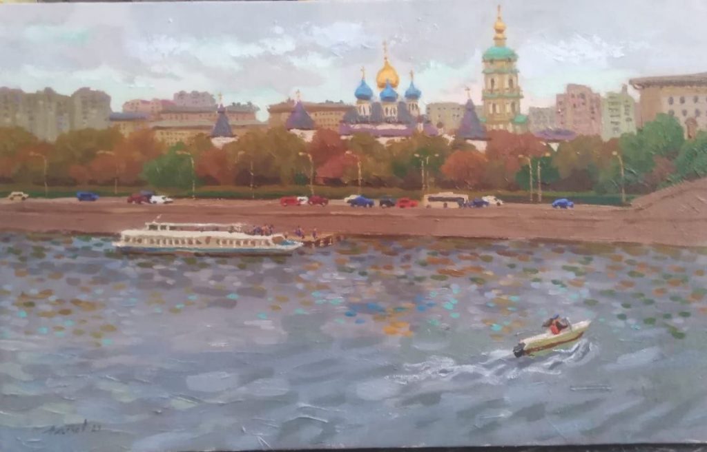 – Эта картина так и называется: «Светлый день». На ней написана река с корабликами, а за ней – монастырь. Готовясь к написанию этого полотна, я приехал в Новоспасский монастырь, гулял по нему и вокруг. Искал что-то свое, ведь для того, чтобы картина получилась, сюжет должен срезонировать с душой. Был серый день, начало осени, но у меня было радостное настроение. Я посмотрел на монастырь через реку – и увидел то, что хотел сказать: когда сердце наполнено радостью, ты смотришь на мир иначе, все кажется волшебным, сказочным.