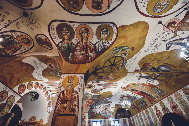 – Конечно. В частности, росписи, которые начали делать еще в 1996-м году, а закончили в 2000-м. Расписывал молодой художник Лаша Кинцурашвили, выпускник Тбилисской Художественной Академии. Это был очень большой труд: он старался объединить историю русской и грузинской святости. Поэтому в центральной части храма у нас написаны традиционные сюжеты, в частности, вселенские святители – Иоанн Златоуст, Василий Великий, Григорий Богослов, святитель Николай.