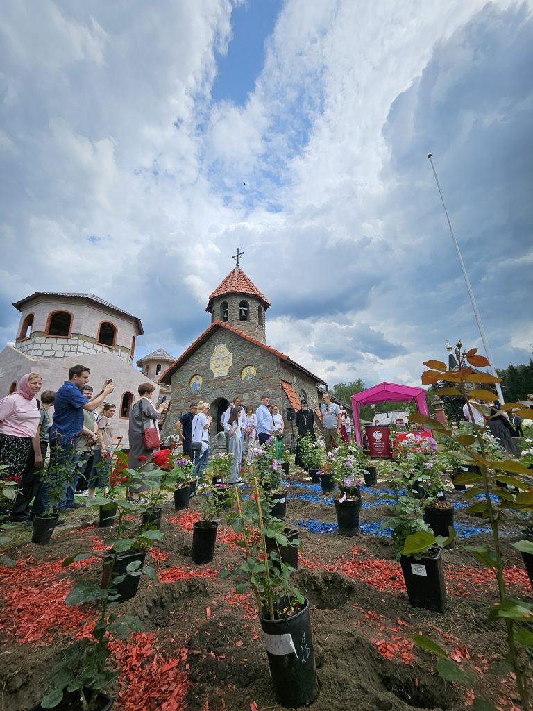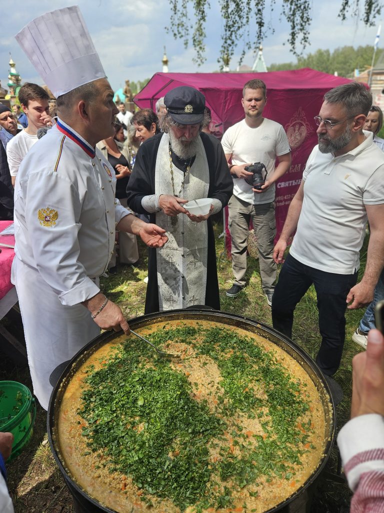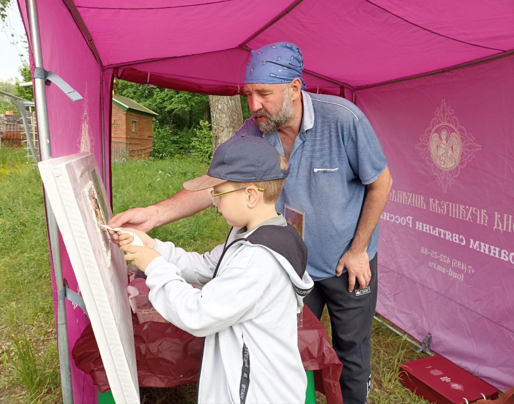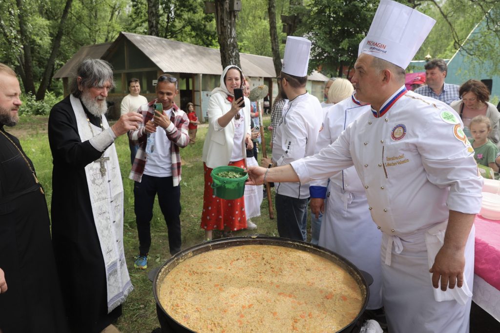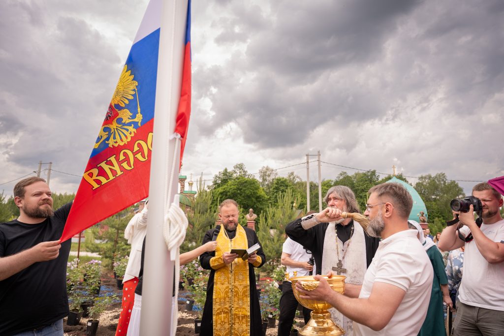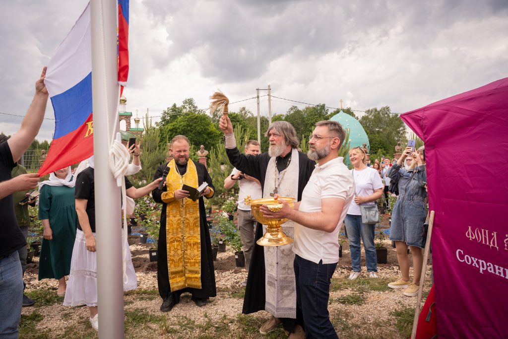 Мы дружно приняли участие в молебне, который совершили о. Фёдор Конюхов и благочинный Заокского района Тульской области протоиерей Евгений Кириченко. Освятили и подняли Российский флаг. Полюбовались необычными картинами о. Фёдора. Отведали вкусной «Русской ратной» каши, которую приготовили в 170-литровом казане шеф-повара из Международной ассоциации профессиональных кулинаров России. Выложили мозаику. Высадили триколор из роз. Удивительно: в композицию вошло около 120 цветочных кустов – как будто в знак того, что на данный момент Фонд оказал поддержку 120 с небольшим храмам!