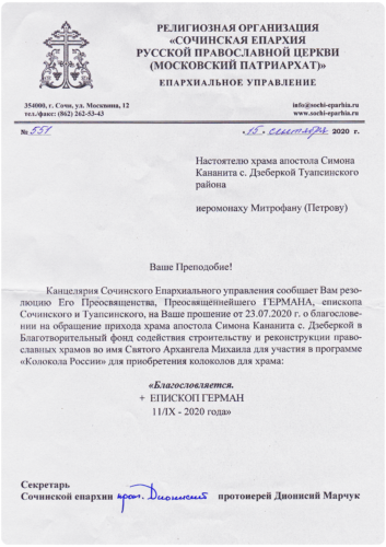 Приход храма в честь апостола Симона Канонита и настоятель храма иеромонах Митрофан (Петров) от всей души благодарят каждого, кто принял участие в сборе средств на приобретение набора колоколов для храма.