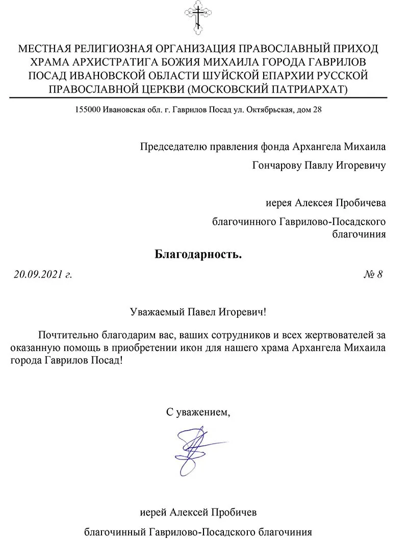 Украсив Михайловский храм, Вы возвратили жителям Гаврилова Посада частицу утраченной в лихолетье красоты!