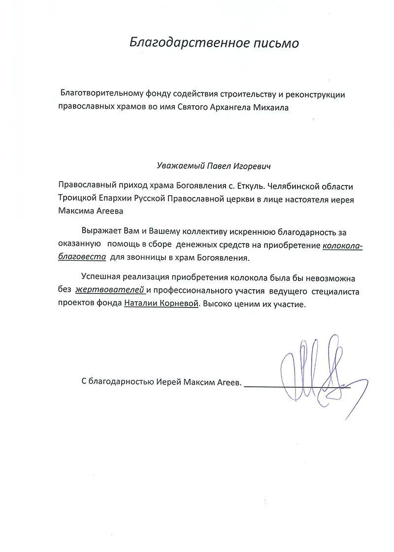 Пожертвовав на колокол, друзья Фонда Архангела Михаила сделали свой вклад в прославление Бога. Сколько людей вспомнит о Боге, осенит себя крестным знамением, услышав звон, – и каждый раз их Ангелы-Хранители помолятся о тех, благодаря кому на звоннице появились колокола.