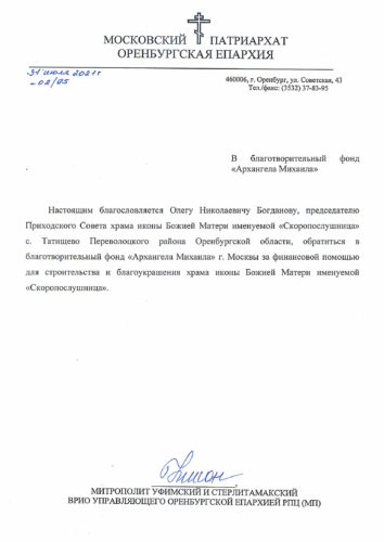 БЛАГОТВОРИТЕЛЬНЫЙ ФОНД СОДЕЙСТВИЯ СТРОИТЕЛЬСТВУ И РЕКОНСТРУКЦИИ ХРАМОВ ВО ИМЯ СВЯТОГО АРХАНГЕЛА МИХАИЛА