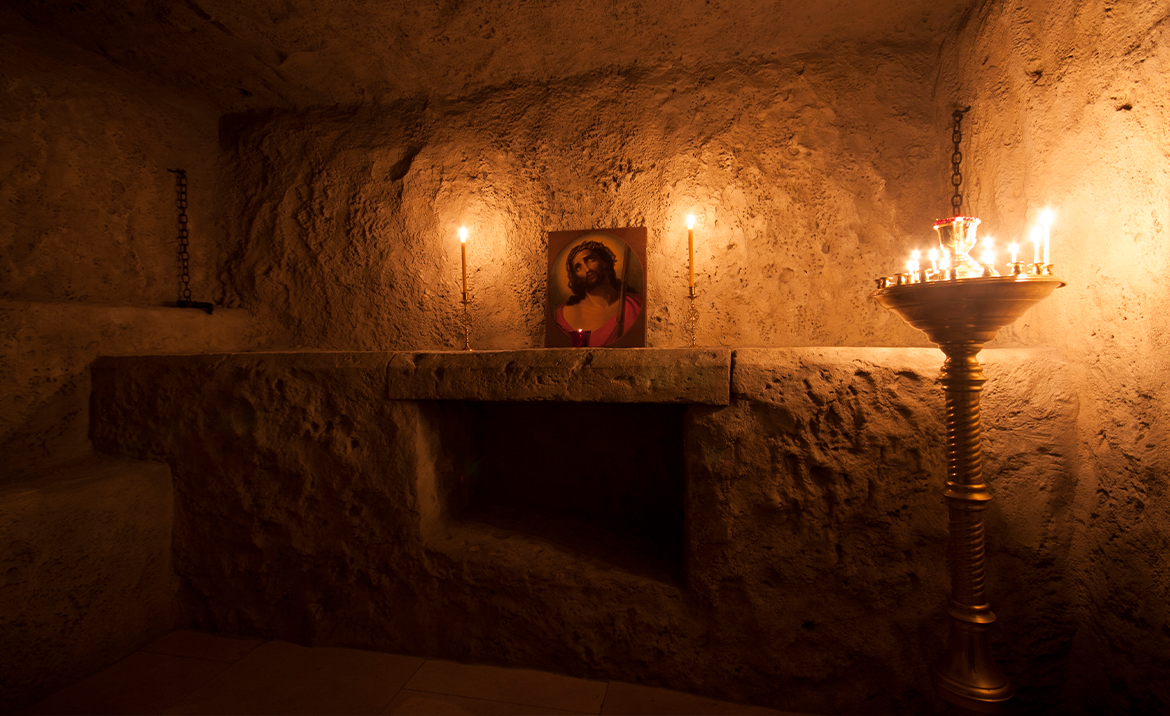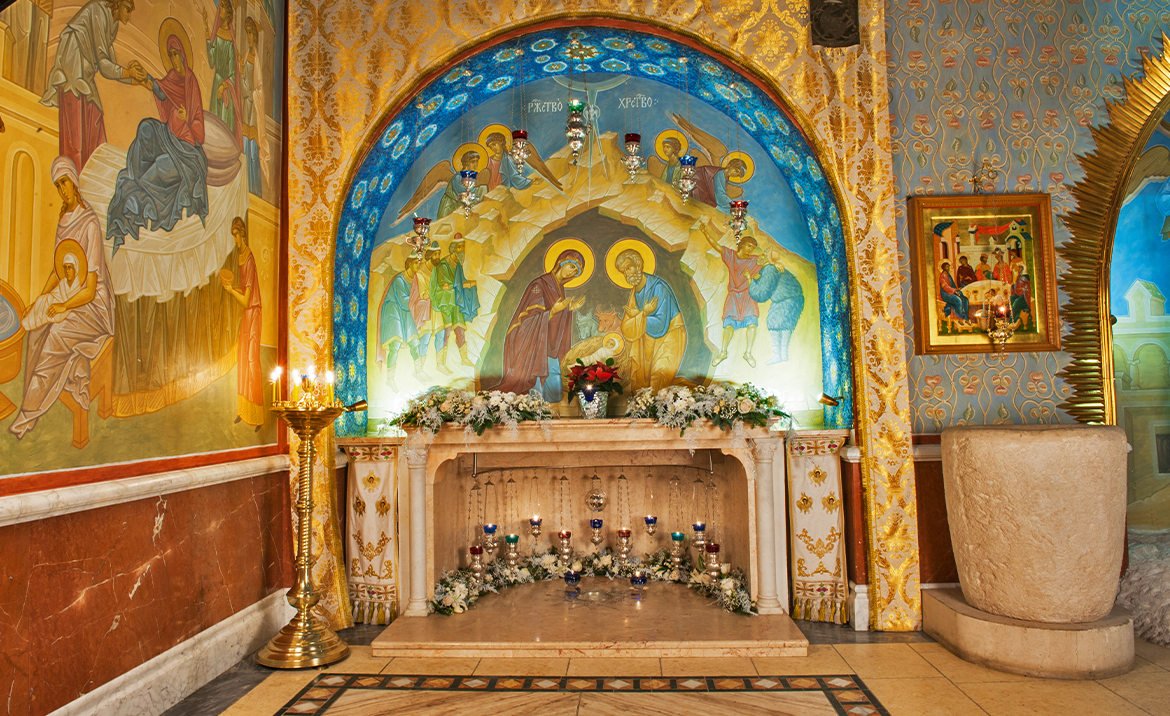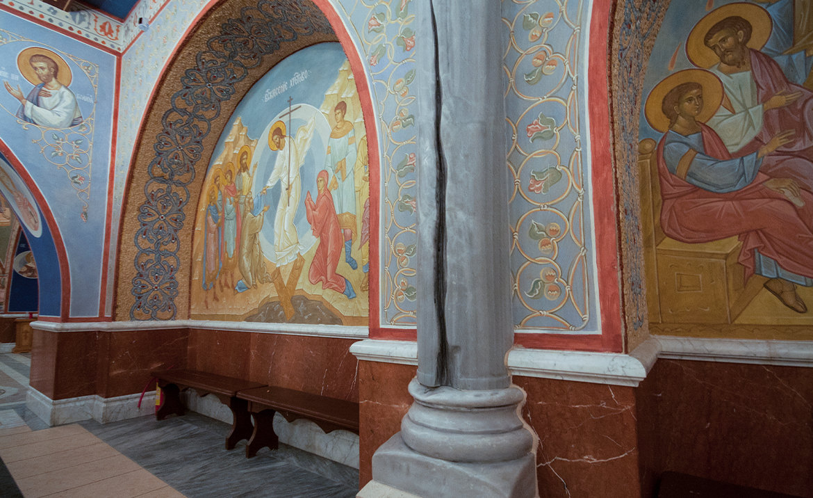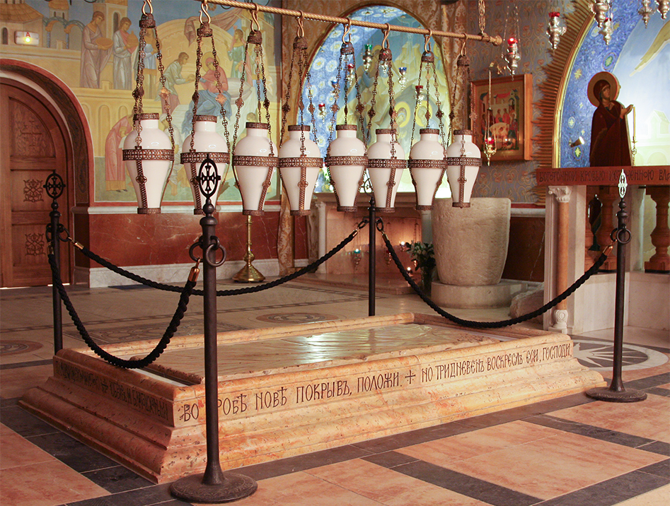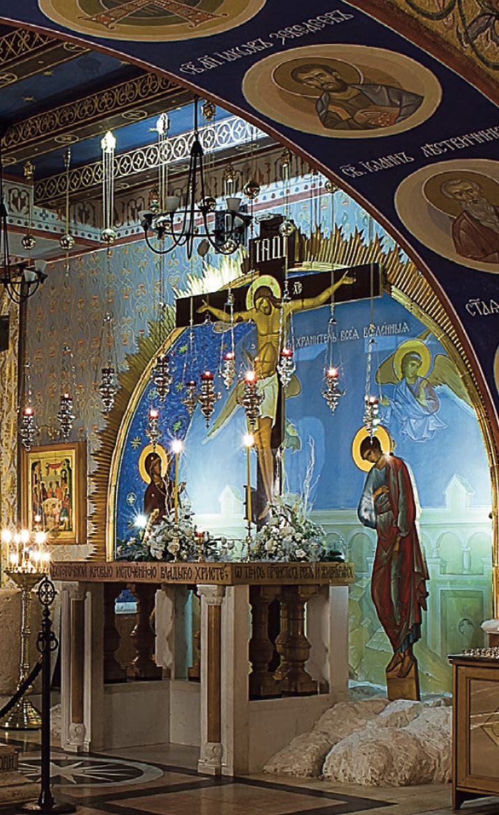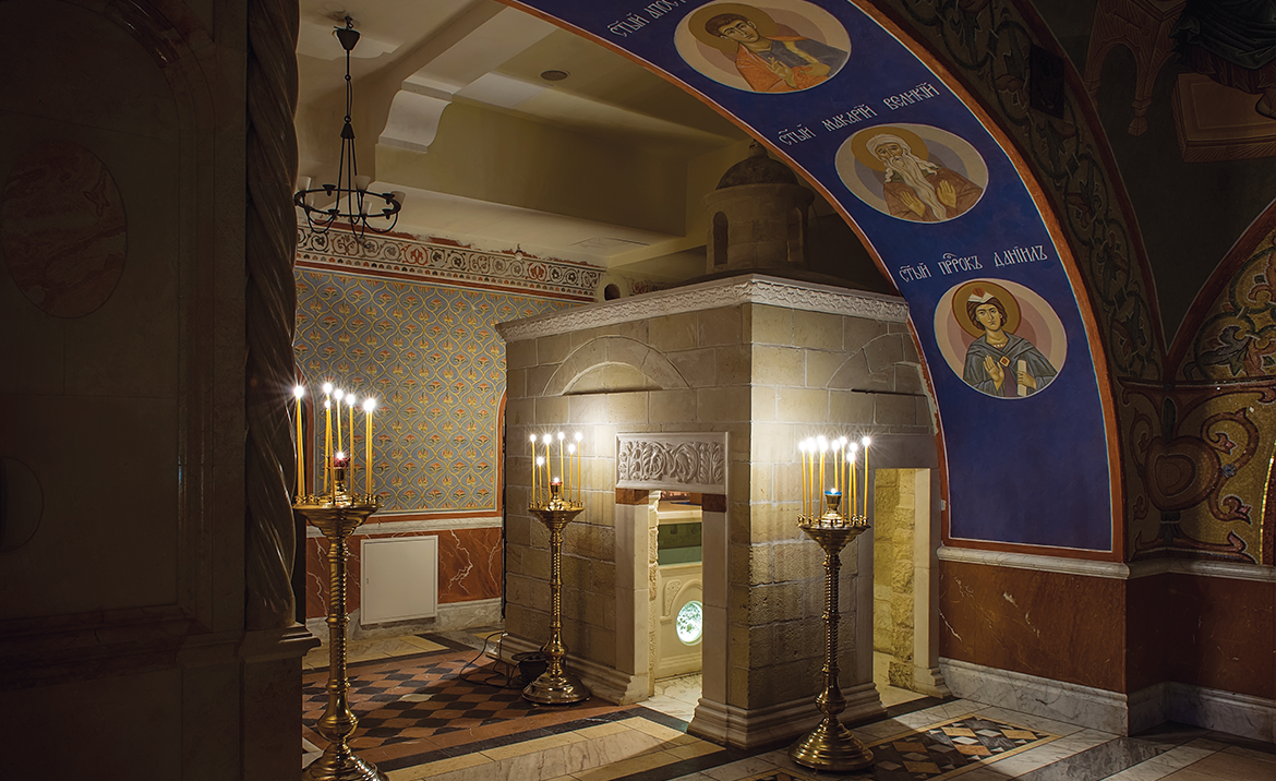 По благословению Святейшего Патриарха Кирилла в 2015 году в нижнем приделе Покровского храма наш Фонд начал писать библейскую историю под Московским небом. Были созданы точные копии величайших христианских святынь: Вифлеемский престол, Темница Господа, Голгофа, Камень Помазания, Гроб Господень, Гробница Богородицы, а также Водонос из Каны Галилейской и Колонна Благодатного Огня. Все они составляют Икону Святой Земли и напоминают нам о ключевых событиях земной жизни Спасителя.