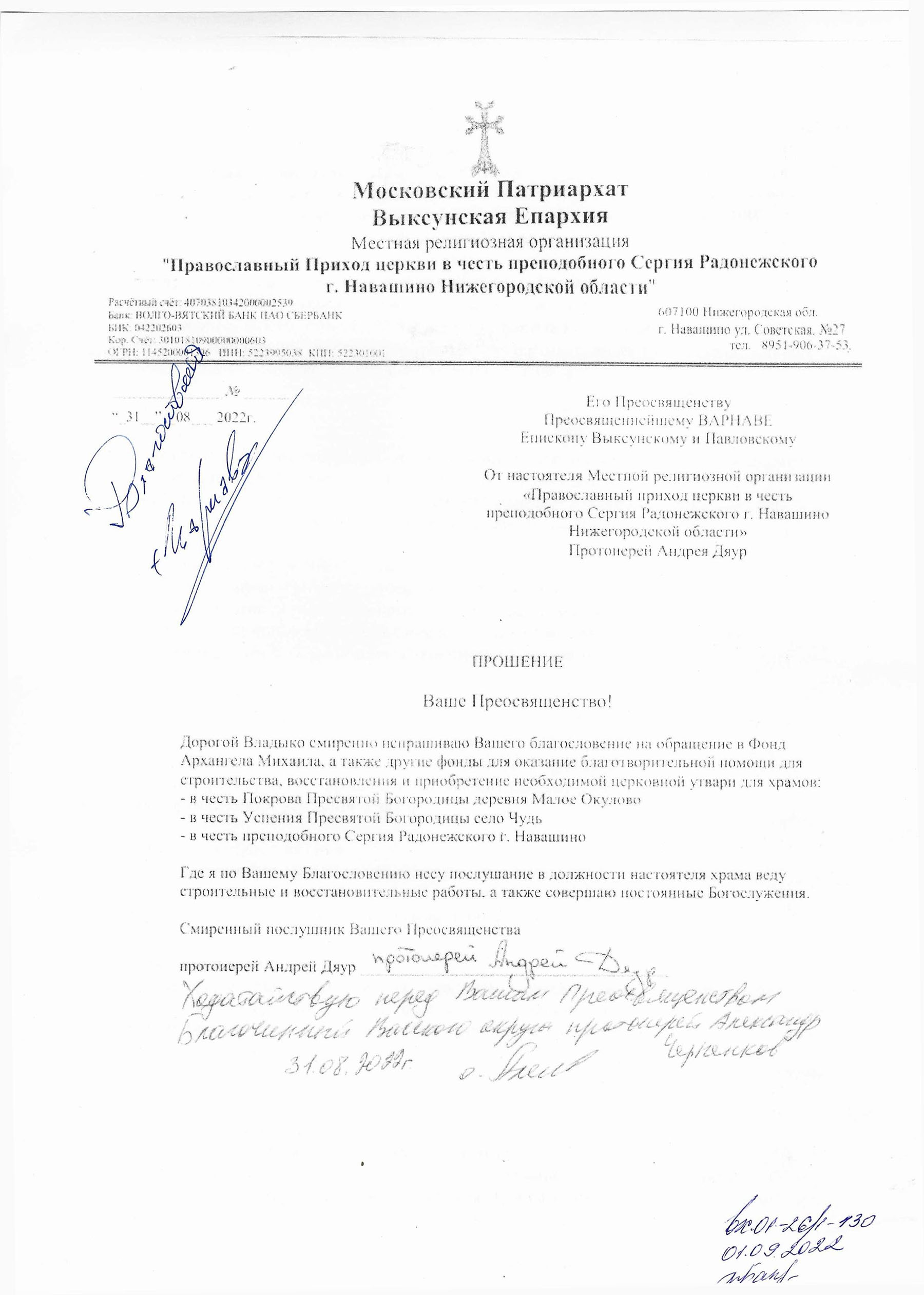 К сожалению, хотя в Навашино и совершаются регулярные богослужения, у прихожан не хватает возможностей даже для того, чтобы приобрести самую необходимую утварь: дарохранительницу, семисвечник и подсвечник. Мы всем миром помогли сделать это. Сбор был завершен как раз к Пасхе 2023 года. Получился прекрасный подарок для батюшки и прихожан к Воскресению Христову!