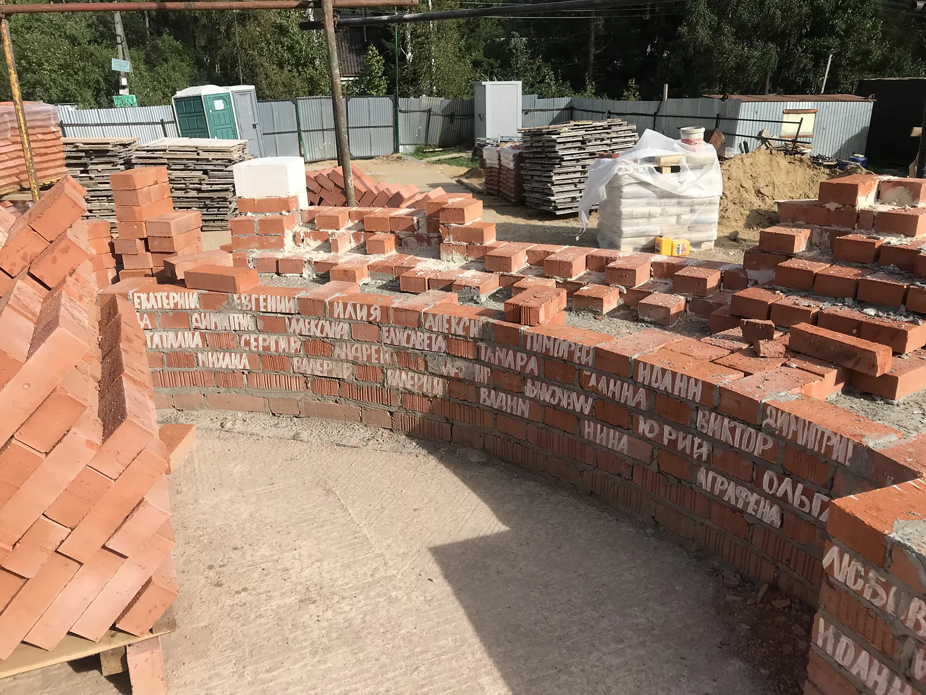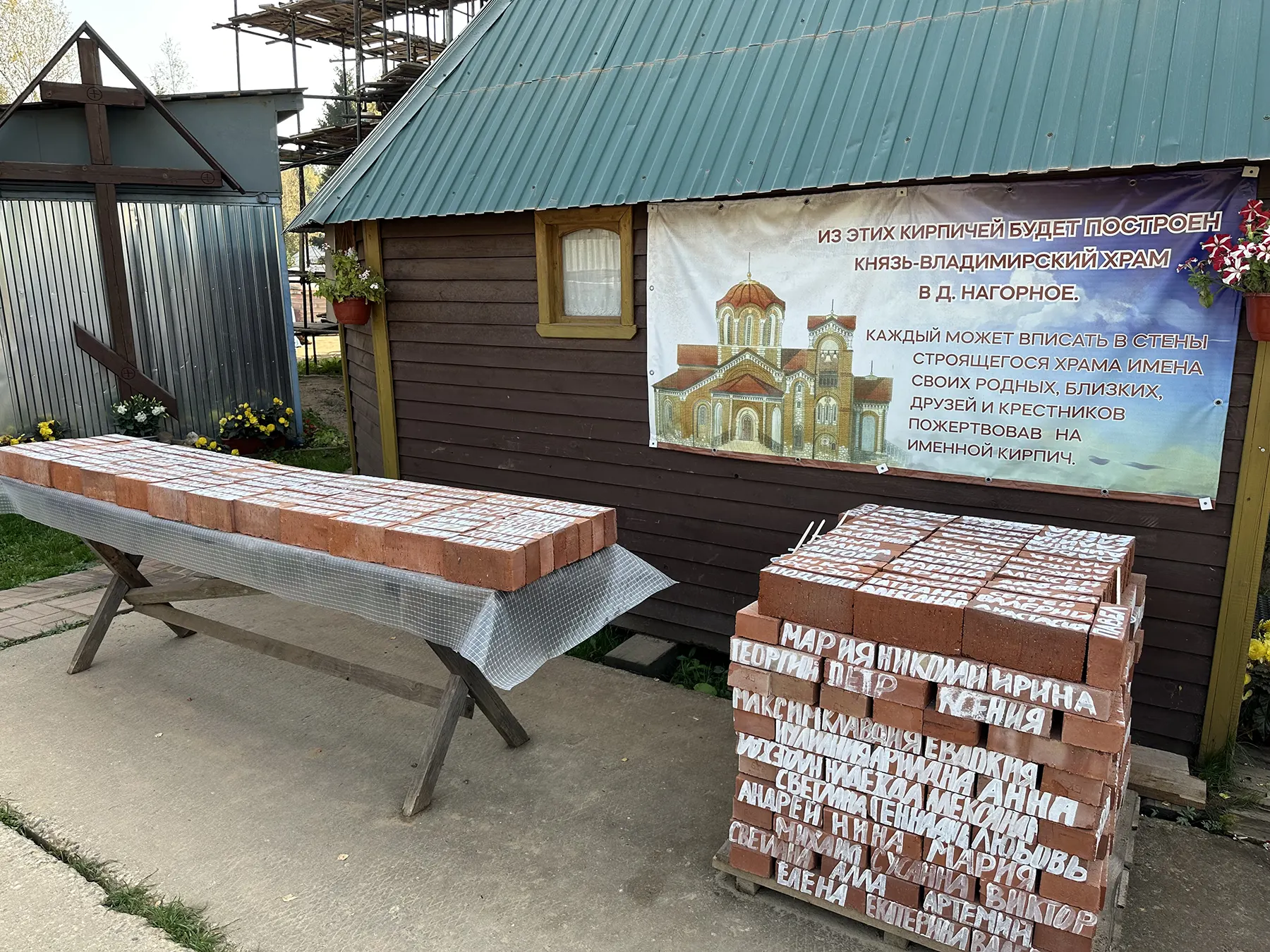 Был момент, когда жители деревни скептически относились к строительству – оно казалось им слишком долгим. Но теперь, когда стены храма стало уже видно из-за ограждения, они воспрянули духом. Однако стройка оказалась под угрозой остановки. Для продолжения работ по кладке стен верхнего храма было необходимо закупить 13 600 штук красного керамического кирпича. Община Князь-Владимирского храма обратилась с просьбой о помощи к Фонду Архангела Михаила. Для того чтобы помочь быстрее и строительство не остановилось, была задействована часть средств из Общего сбора. По завершении сбора мы, пригласив с собой людей, которые жертвовали на храм, приехали в Нагорное. Встреча была очень радостной! Гости дружно подписывали на кирпичах имена тех, кто жертвовал на их приобретение, а затем мы вместе с о. Георгием отправились в паломничество в Троице-Сергиеву Лавру и Спасо-Вифанский монастырь. По дороге батюшка рассказал нам много интересного. Низкий поклон ему за это! Надеемся, эта поездка друзей фонда с о. Георгием была не последней.