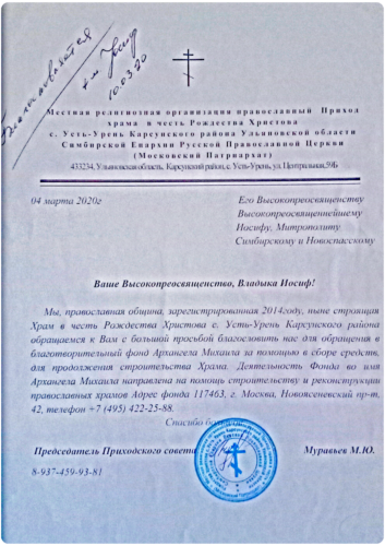 В селе Усть-Урень по желанию жителей и их трудами построен небольшой кирпичный храм. На весну 2021 года запланировано торжественное и долгожданное событие – освящение Престола. Но для того чтобы храм начал полноценно работать, необходима церковная утварь. Сельчанам трудно собрать необходимую сумму, поэтому они обратились к помощи неравнодушных людей.