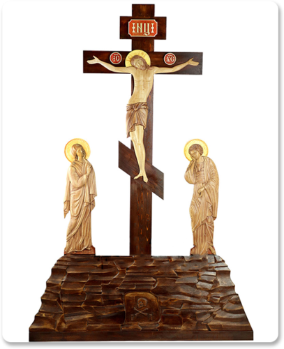 Распятие Христово, перед которым стоят скорбящие Богоматерь и Иоанн Богослов, – атрибут каждого православного храма. Как правило, перед ним помещают канун – подсвечник, на который ставят свечи, молясь об упокоении усопших. Распятие напоминает нам о любви Спасителя, о Его жертве, принесенной ради каждого из нас.