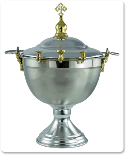 Небольшая купель необходима, чтобы совершать Таинство Крещения. Для Рождественского храма выбрали скромный, но достойный вариант из латуни и пищевой нержавеющей стали, безопасной для здоровья младенцев.