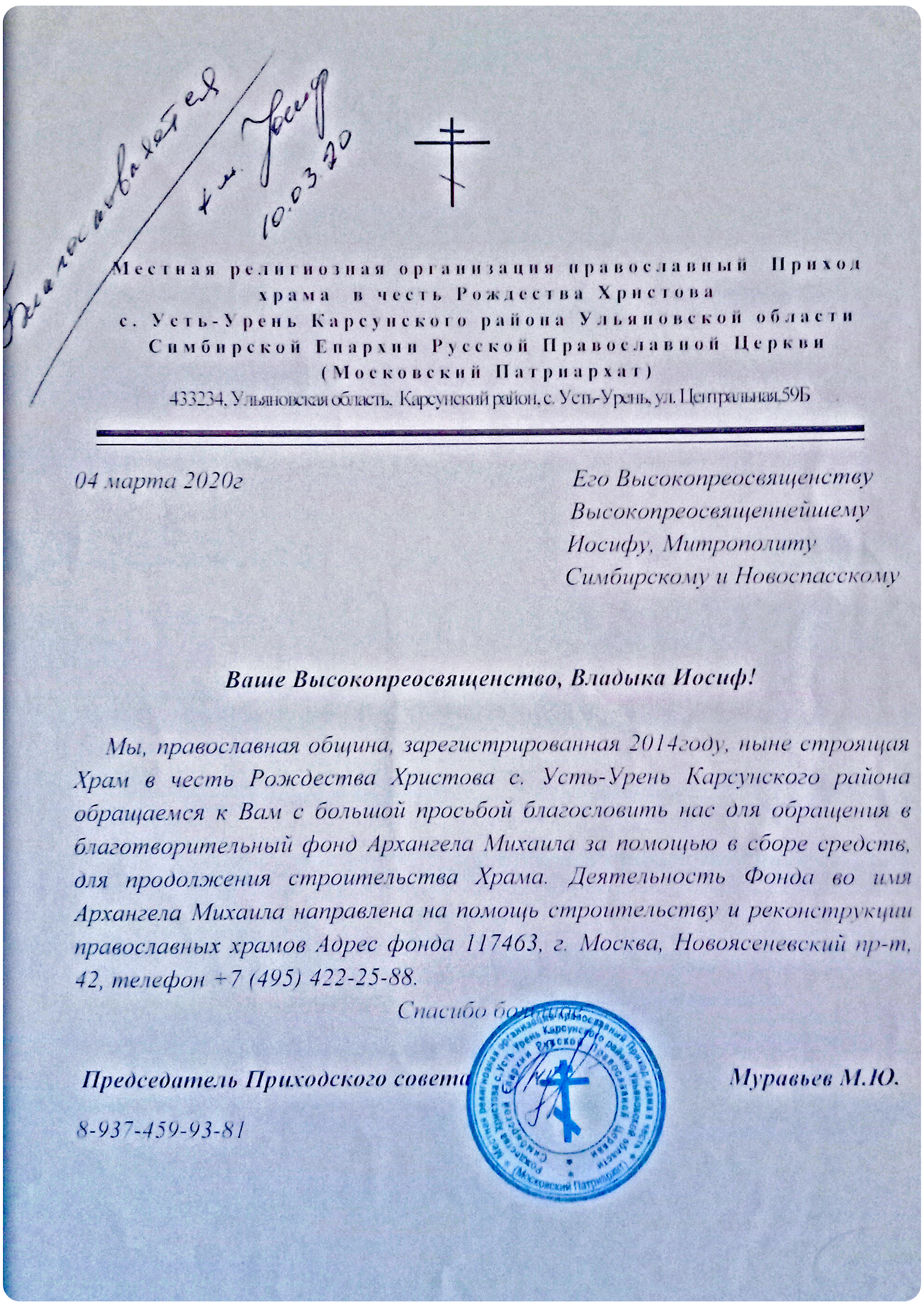 В селе Усть-Урень по желанию жителей и их трудами построен небольшой кирпичный храм. На весну 2021 года запланировано торжественное и долгожданное событие – освящение Престола. Но для того чтобы храм начал полноценно работать, необходима церковная утварь. Сельчанам трудно собрать необходимую сумму, поэтому они обратились к помощи неравнодушных людей.