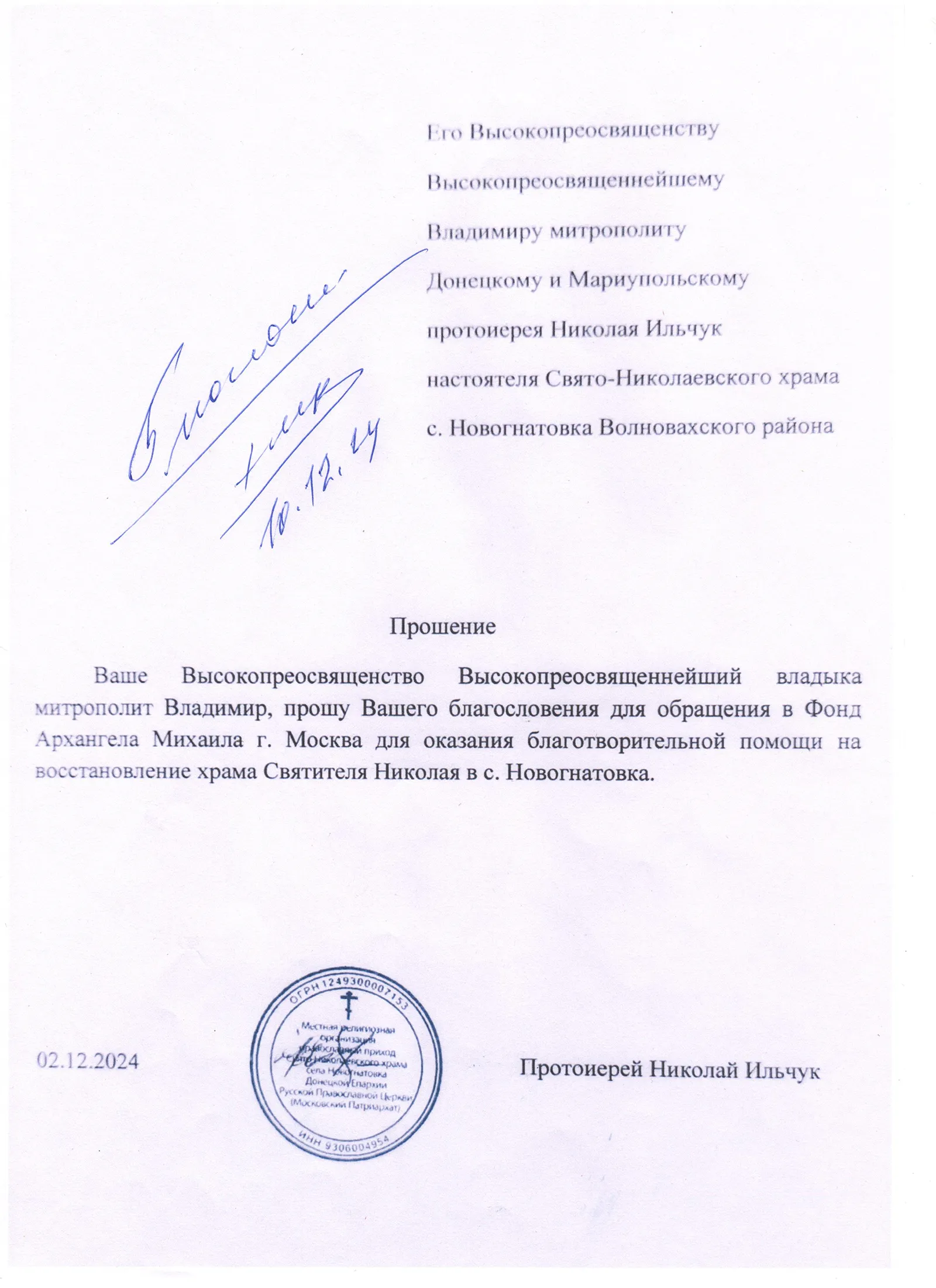 Помочь храму Святителя Николая Чудотворца в Новогнатовке можно онлайн на сайте или отправив СМС на короткий номер 3434 с текстом «НОВОГНАТОВКА» и через пробел указав сумму (Например: НОВОГНАТОВКА 500).