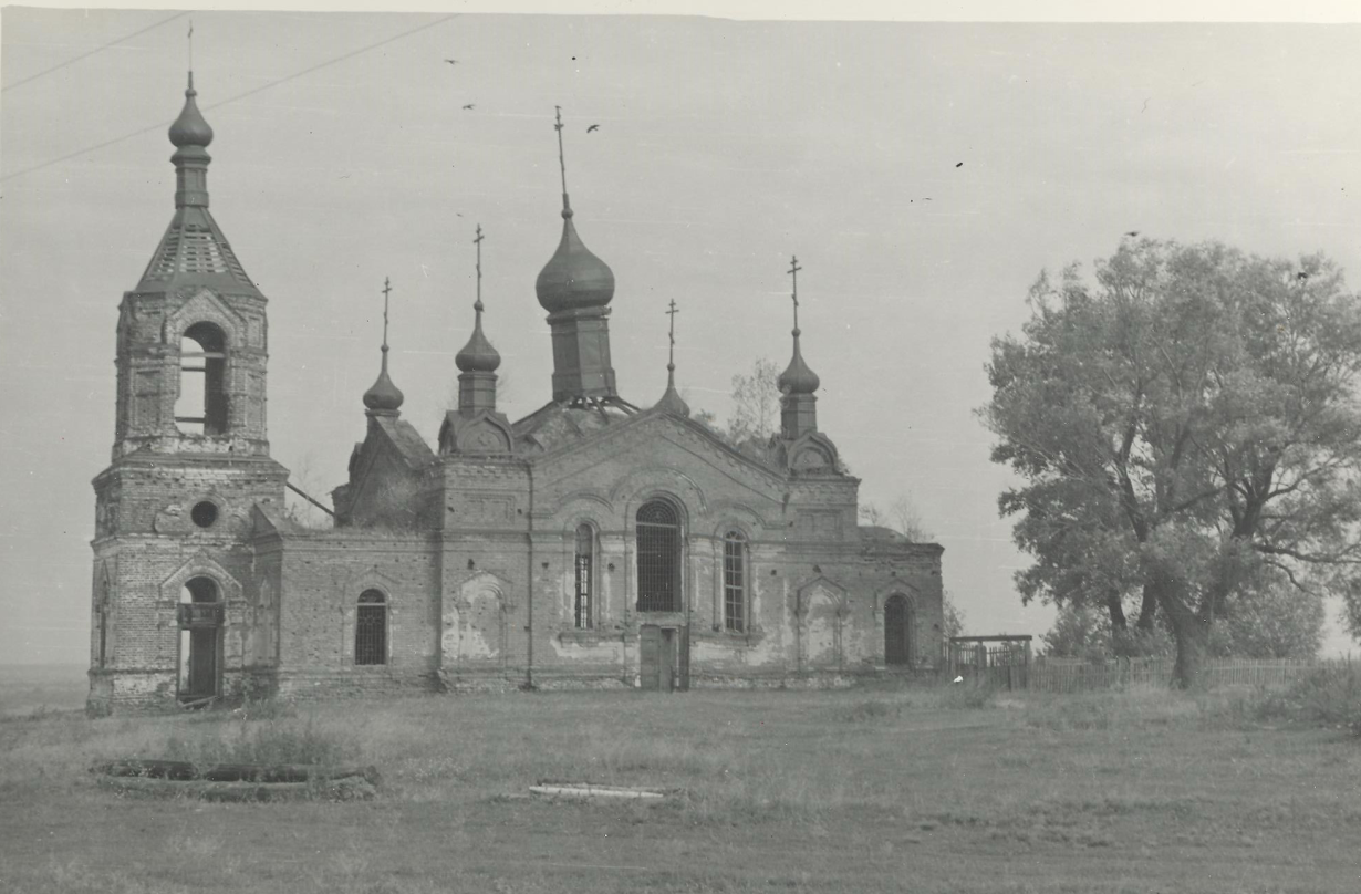 Красивое церковное здание из красного кирпича, в полуразрушенном виде сохранившееся до наших дней, возвели в 1905 – 1911 годах. Главный придел этого храма освятили в честь Пресвятой Троицы, а боковые – в честь Успения Пресвятой Богородицы и Трех святителей: Василия Великого, Григория Богослова и Иоанна Златоуста. До революции при храме действовала церковно-приходская школа, где учились сельские ребятишки. Храм был довольно богат: согласно описи 1927 года, на его колокольне было 7 колоколов: благовестники весом 205, 110 и 33 пуда, а также 4 малых колокола. Среди указанного в описи имущества обращают на себя внимание 2 позолоченные и 2 посеребренные дарохранительницы, 3 серебряных сосуда, 2 серебряных креста, 1 серебряный ковш, а также Евангелие, окованное серебром – они сохранились в 20-е годы, когда под видом помощи голодающим советская власть изымала церковные ценности. Храм украшал трехъярусный иконостас с написанными маслом иконами.
