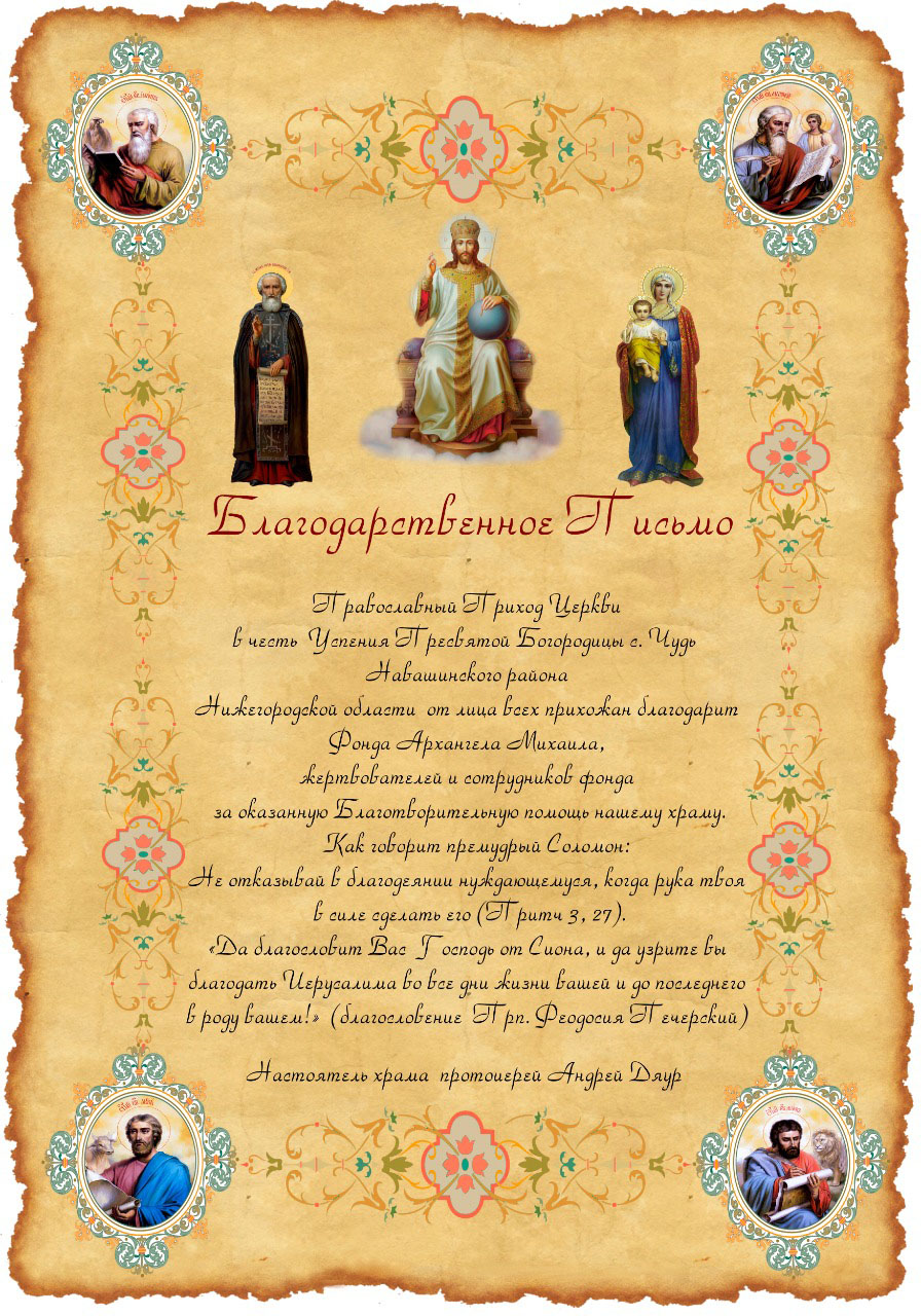 • Устав организации «БЛАГОТВОРИТЕЛЬНЫЙ ФОНД СОДЕЙСТВИЯ СТРОИТЕЛЬСТВУ И РЕКОНСТРУКЦИИ ХРАМОВ ВО ИМЯ СВЯТОГО АРХАНГЕЛА МИХАИЛА»;