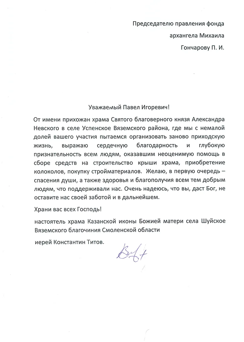 БЛАГОТВОРИТЕЛЬНЫЙ ФОНД СОДЕЙСТВИЯ СТРОИТЕЛЬСТВУ И РЕКОНСТРУКЦИИ ХРАМОВ ВО ИМЯ СВЯТОГО АРХАНГЕЛА МИХАИЛА (Председатель Cовета учредителей: Гончаров Павел Игоревич),