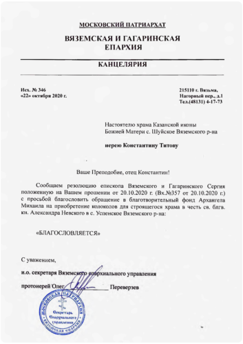- Благословение Епархии на обращение в Фонд