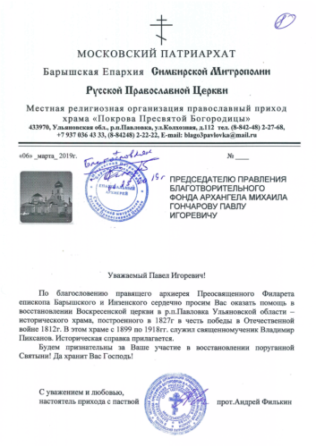 БЛАГОТВОРИТЕЛЬНЫЙ ФОНД СОДЕЙСТВИЯ СТРОИТЕЛЬСТВУ И РЕКОНСТРУКЦИИ ХРАМОВ ВО ИМЯ СВЯТОГО АРХАНГЕЛА МИХАИЛА (Председатель Cовета учредителей: Гончаров Павел Игоревич),