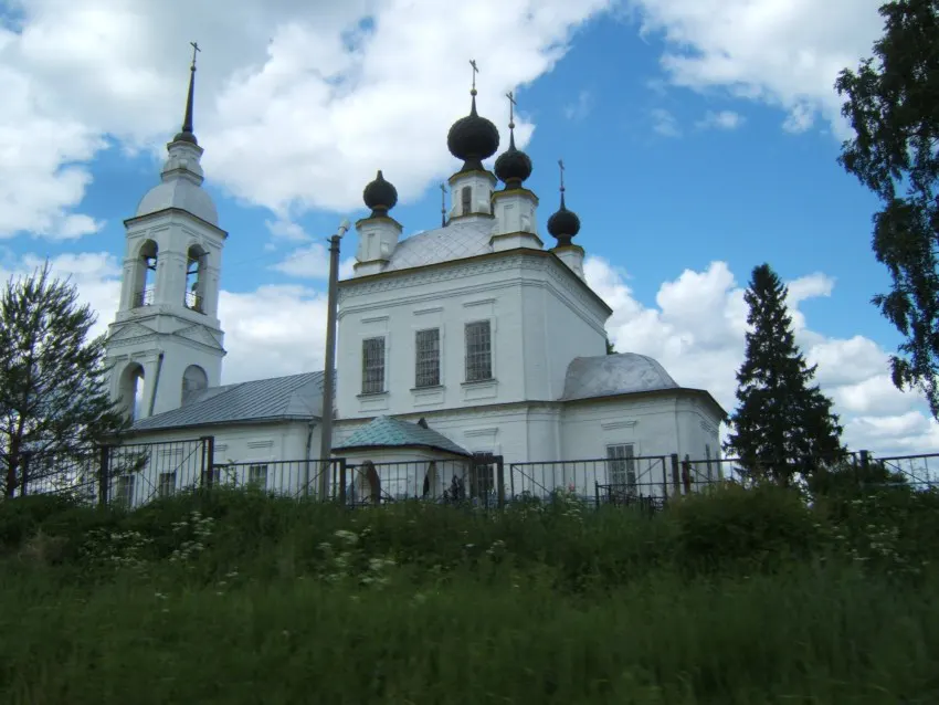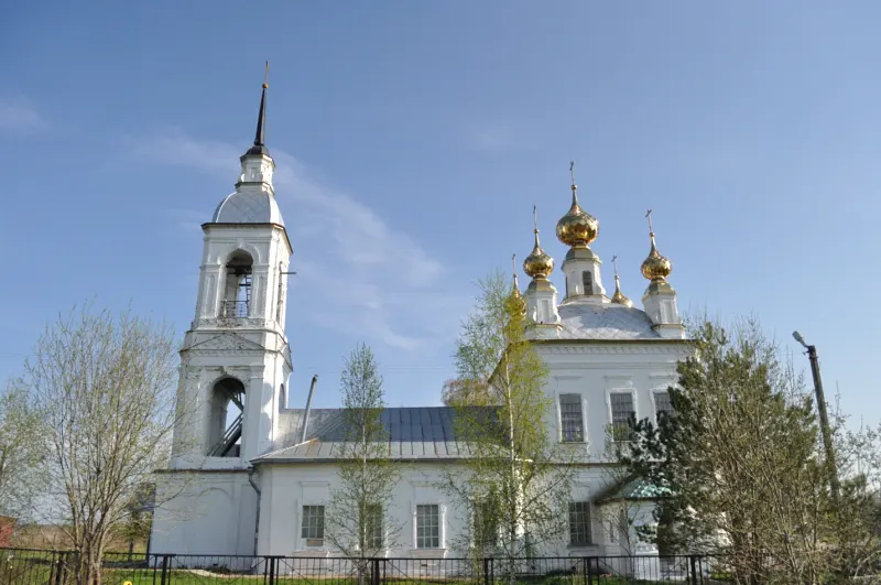 В храме три придела: главный – в честь Воскресения Христова, и боковые – в честь древнего великомученика, покровителя воинов Димитрия Солунского и в честь новомучеников св. Вениамина, митрополита Петроградского и пострадавших с ним. Изящная каменная церковь с увенчанной высоким шпилем колокольней является главным украшением местности. Стоящая на берегу реки, белая, с небольшими маковками, она видна издалека – неотъемлемая часть исконно русского пейзажа.