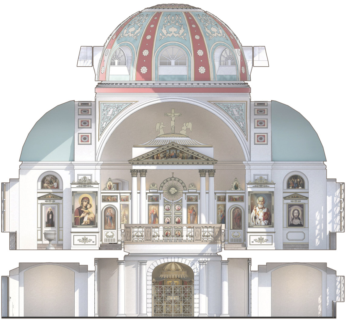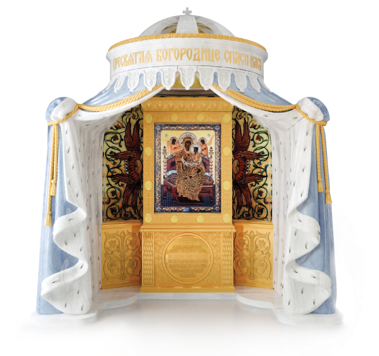 Поистине уникальным изделием храмового искусства стала сень для иконы «Всецарица». Это скульптура сложной формы: из гранита и мрамора вырезан балдахин, имитирующий пышные ниспадающие складки ткани и меха горностая. Создатели сени вдохновлялись обликом царского трона, находящегося под великолепным балдахином, ведь Божия Матерь – Всецарица, Царица Неба и земли!