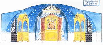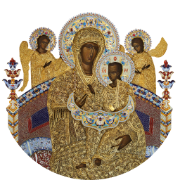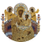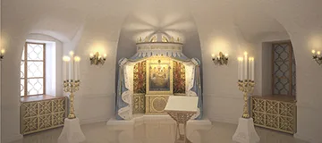 Композиция киота и сени объединяет в себе лучшие материалы и техники церковного благоукрашения: чеканный металл с золочением, мозаику и благородный камень.