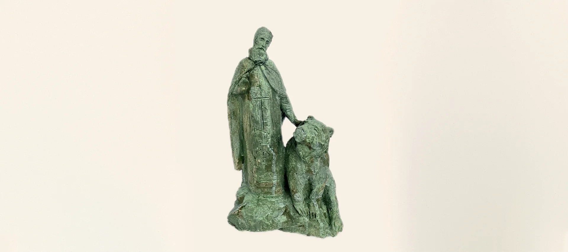 Памятник преподобному Сергию Радонежскому стал гармоничной частью храмового комплекса. «Наш детский культурный центр будет называться «Доверие» – пояснил отец Пётр, когда мы еще только приступали к сбору. – Фигура преподобного Сергия, который гладит медведя, а тот доверчиво льнет к нему, станет его эмблемой. Это образ доброты».