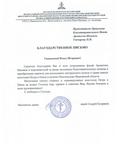 БЛАГОТВОРИТЕЛЬНЫЙ ФОНД СОДЕЙСТВИЯ СТРОИТЕЛЬСТВУ И РЕКОНСТРУКЦИИ ХРАМОВ ВО ИМЯ СВЯТОГО АРХАНГЕЛА МИХАИЛА (Председатель Cовета учредителей: Гончаров Павел Игоревич),