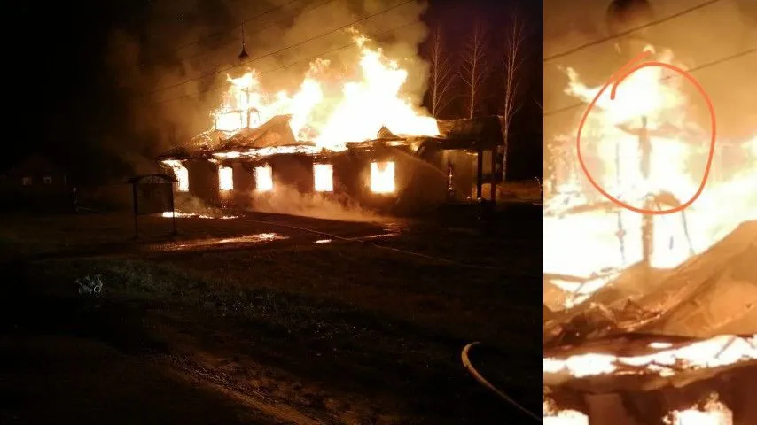 Но Господь не оставил верующих. В самом испытании Он послал им и утешение через Свои явные чудеса. На фотографии пожара запечатлелось Распятие. Его отчетливо видно в огненном вихре, который закрутился на барабане уже рухнувшего купола над алтарем.