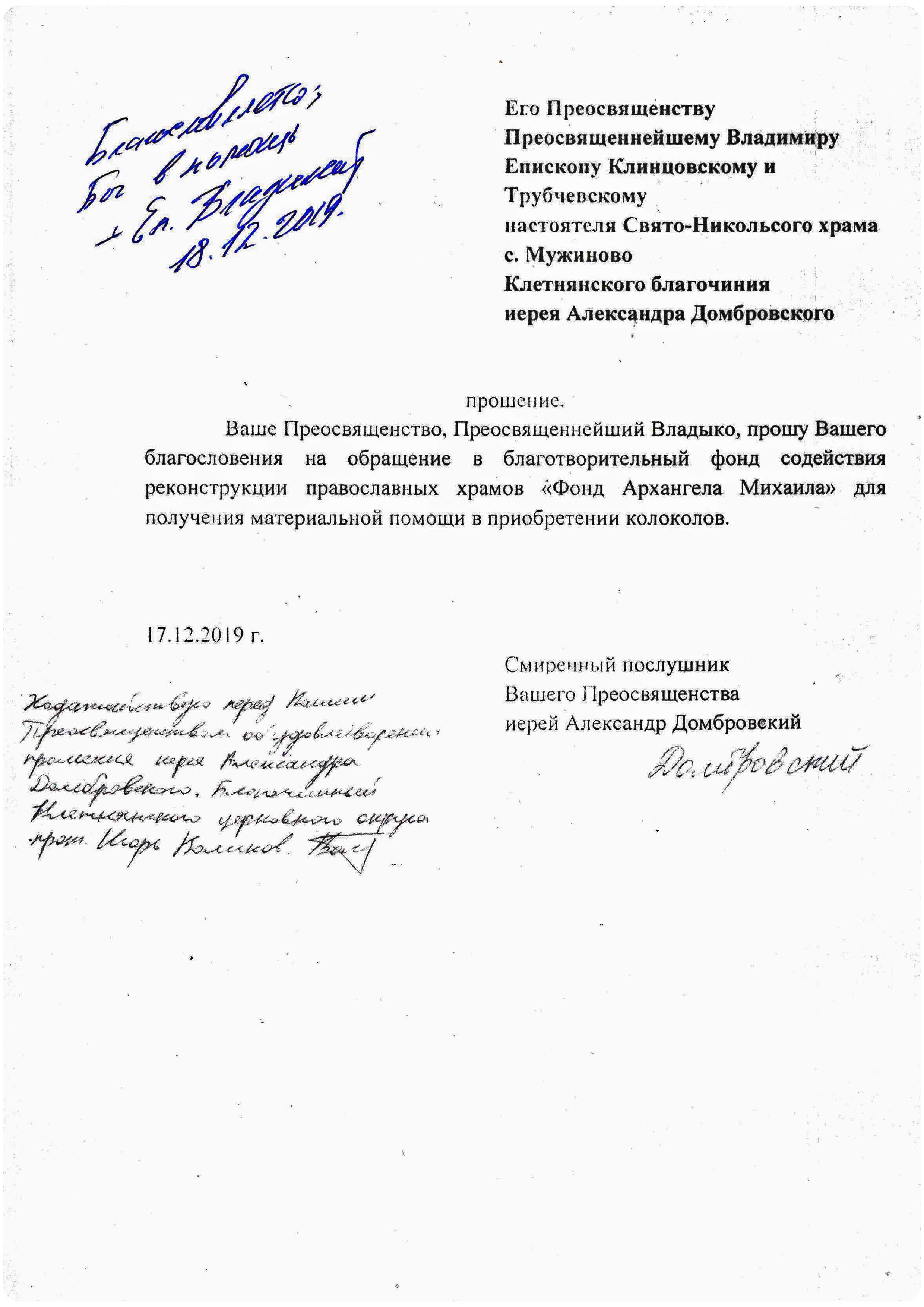 На колокольне храма в Мужиново был лишь один колокол – благовестник. Он созывал верующих на богослужение мерными ударами – благовестом. А вот зазвонных – небольших по массе, необходимых для совершения трезвона, колоколов не было. Между тем трезвон чрезвычайно важен: он выражает торжество Церкви и отмечает определенные места в богослужении. Трезвон ярок, эмоционален, красив.