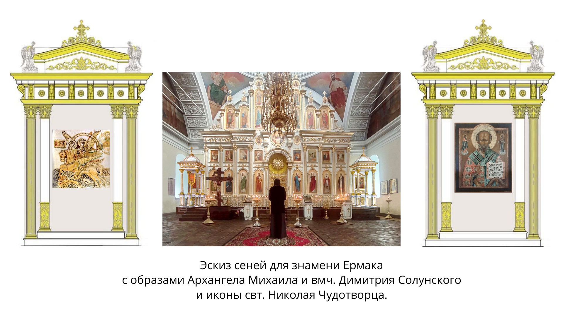 Воссозданное знамя будет возвращено на свое историческое место – в Свято-Никольский собор. Но для святыни нужно достойное вместилище: киот с сенью. Его проект уже разработали: резной деревянный киот под пышной изящной сенью установят на солее перед иконостасом храма с левой стороны. Сень для святыни станет настоящим произведением церковного искусства, достойным украшением храма: на высоких колоннах, увенчанная крестом…