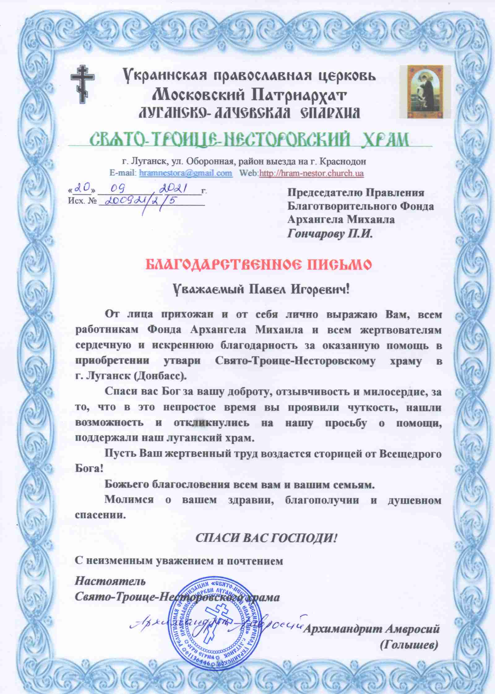БЛАГОТВОРИТЕЛЬНЫЙ ФОНД СОДЕЙСТВИЯ СТРОИТЕЛЬСТВУ И РЕКОНСТРУКЦИИ ХРАМОВ ВО ИМЯ СВЯТОГО АРХАНГЕЛА МИХАИЛА (Председатель Cовета учредителей: Гончаров Павел Игоревич),