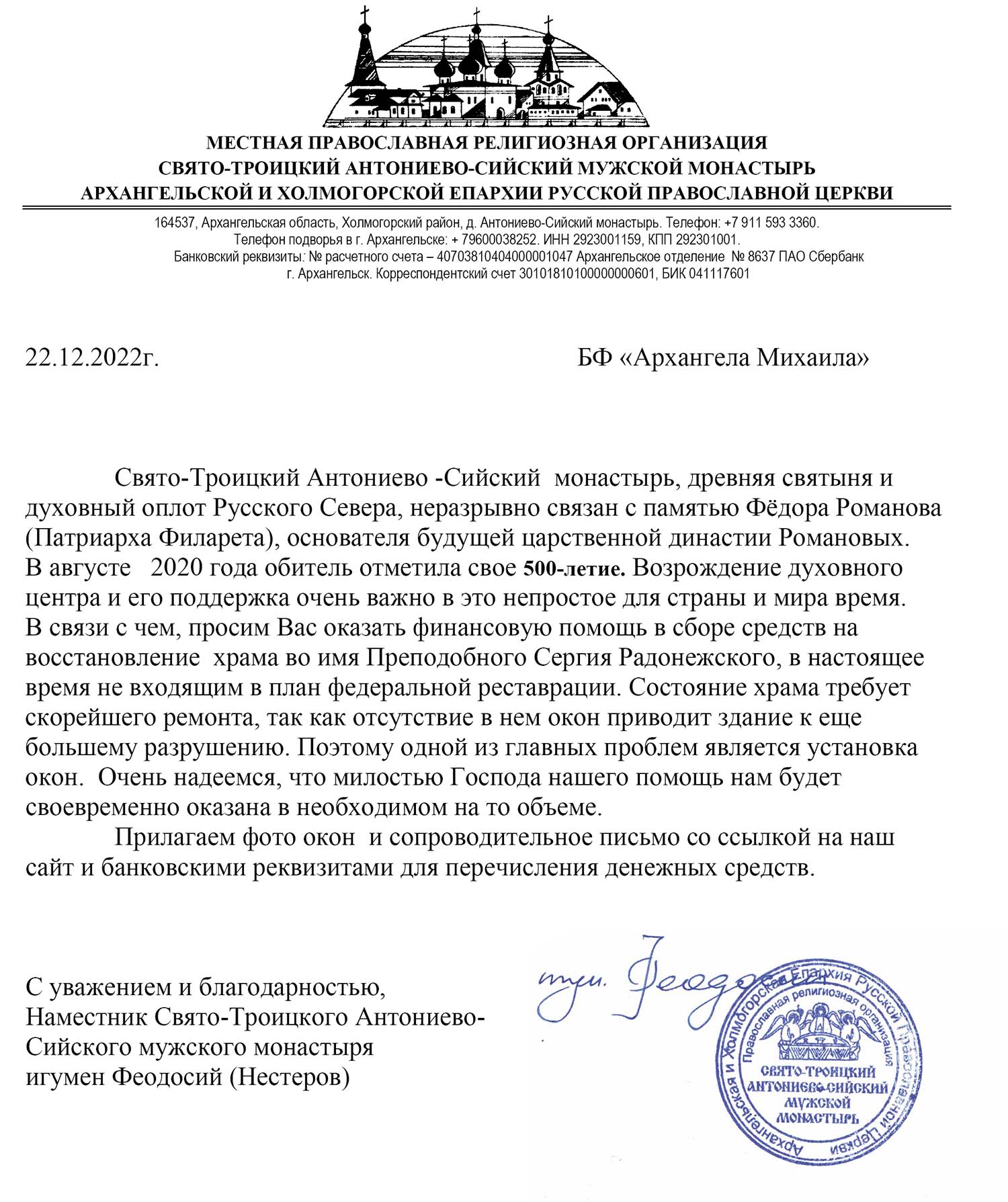 Антониево-Сийский монастырь – удивительная обитель Русского Севера, архитектурный ансамбль которой сложился в XVII столетии. Неравнодушные люди, объединенные нашим Фондом, уже дважды оказали ему поддержку. Сначала мы помогли спасти от разрушения его Благовещенскую церковь – один из немногочисленных сохранившихся до наших дней шатровых храмов. Затем приняли участие в реставрации надвратной церкви монастыря, посвященной преподобному Сергию Радонежскому. Мы собрали средства на окна для нее. На обоих этапах оказать оперативную помощь нам помог Общий сбор – из него мы взяли часть необходимой суммы. На Общий сбор жертвуют люди, которые хотят помочь тем нашим подопечным храмам и монастырям, которым необходима самая срочная помощь. И старинный Антониево-Сийский монастырь безусловно таков!